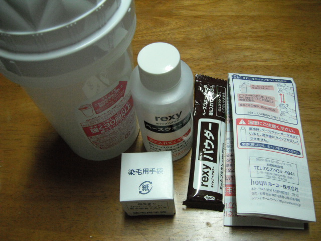 パウダー状の1剤・無色液体2剤・手袋・説明書